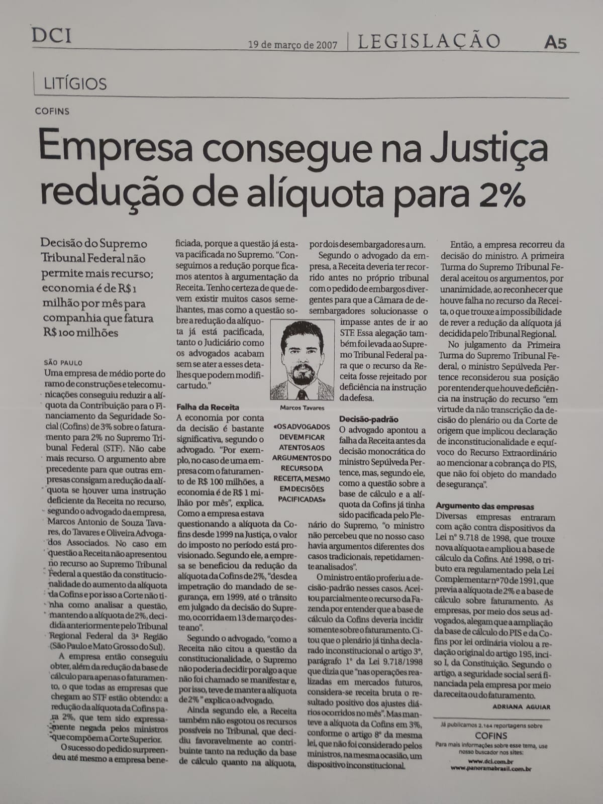 O Tavares e Oliveira Advogados Associados obtém no Supremo Tribunal Federal decisão sem precedentes que reduz a alíquota da Cofins incidente sobre o faturamento de uma empresa cliente do escritório. Em entrevista ao DCI e Valor Econômico, Dr. Marcos Antonio de Souza Tavares destaca “O resultado demonstra que, mesmo na área tributária, o profissional deve, independentemente da posição doutrinária ou jurisprudencial dominante, dispensar, de forma individualizada, especial atenção ao caso, utilizando, para tanto, todos os meios legais e éticos existentes, buscando sempre o melhor resultado possível. Os clientes, certamente, agradecerão”.