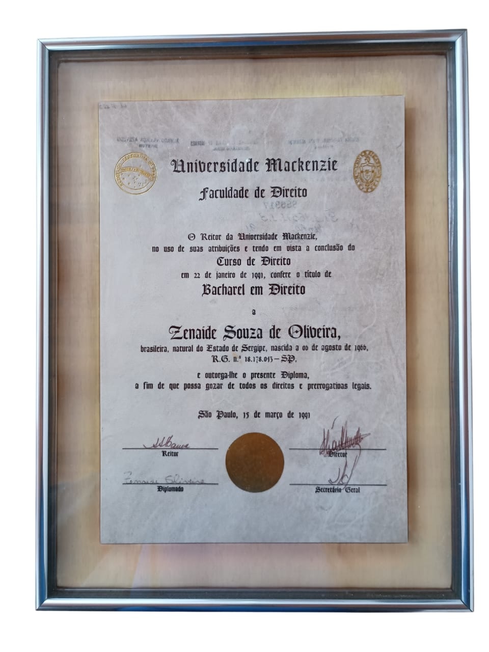 Dra. Zenaide Souza de Oliveira gradua-se em Direito pela Universidade Presbiteriana Mackenzie.